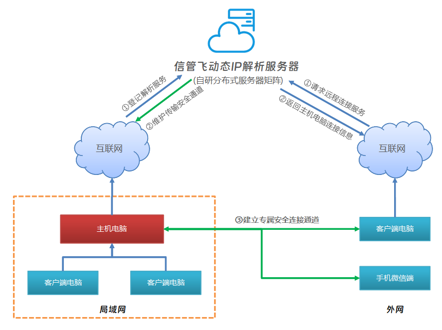 信管飛動態(tài)IP解析服務是亞拓軟件自主研發(fā)的第二代解析服務,采用自研分布式服務器架構(gòu),無需路由器端口映射,也不需要公網(wǎng)IP,可實現(xiàn)外網(wǎng)電腦和手機端連接內(nèi)網(wǎng)信管飛管理軟件。本增值服務內(nèi)置于信管飛軟件,不需要單獨安裝軟件,僅需簡單兩步配置解析帳號和密碼即可。本增值服務采用專屬安全技術,只支持我司開發(fā)的信管飛系列管理軟件產(chǎn)品,不適用于其他公司開發(fā)的管理軟件。