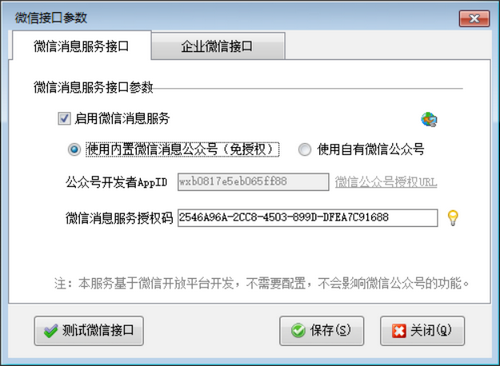 在功能導航窗點擊“擴展應用”,打開“微信接口參數”進行配置。支持內置微信消息公眾號和自有微信公眾號發送兩種方式,如下圖所示: