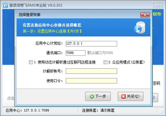(2)互聯(lián)網(wǎng)遠(yuǎn)程使用:如果是通過互聯(lián)網(wǎng)遠(yuǎn)程連接(比如異地使用),軟件支持動(dòng)態(tài)IP解析服務(wù)和云應(yīng)用(云賬套)兩種方式(均為增值服務(wù),需按年付費(fèi))。購買后輸入我們提供的IP解析帳號(hào)、使用口令或通行證帳號(hào)、密碼,然后點(diǎn)“下一步”按鈕,選擇要登錄的賬套。