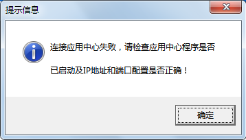 ????在登錄窗口,點(diǎn)“登錄”按鈕,即可登錄軟件。如果主機(jī)電腦沒有運(yùn)行應(yīng)用中心程序或者主機(jī)電腦的IP地址變了,軟件會(huì)彈出如下提示信息: