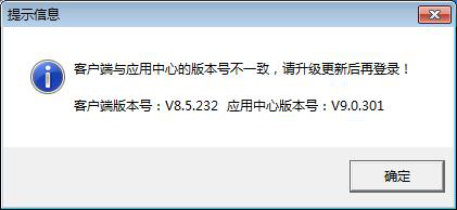 ????(4)客戶端程序登錄的時(shí)候,如果發(fā)現(xiàn)與主機(jī)電腦上的應(yīng)用中心程序版本號(hào)不一致,會(huì)提示如下信息,用相同版本的安裝程序安裝一下即可。