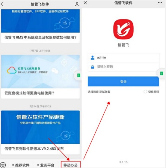 ????移動(dòng)端是在手機(jī)微信上登錄的,使用微信端服務(wù)需要微信先關(guān)注信管飛微信公眾號(hào)“信管飛軟件”,在微信公眾號(hào)界面選擇“移動(dòng)辦公”進(jìn)入。具體如何使用可參考以下操作步驟。