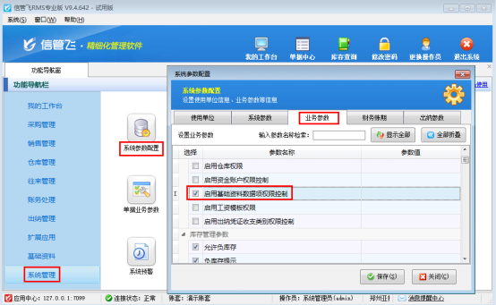 進入「系統管理」→「系統參數配置」→「業務參數」,在“系統安全及權限參數”中勾選“啟用基礎資料數據項權限控制”,保存即可。
