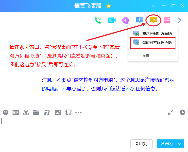 打開QQ并添加我們的客服QQ號為好友(添加任一客服QQ即可,請勿重復添加),然后在QQ聊天窗口,點擊“遠程桌面”-》“邀請對方協助”如下圖所示(我們以QQ9.4.5版本為例,之前版本的操作方法基本一樣):